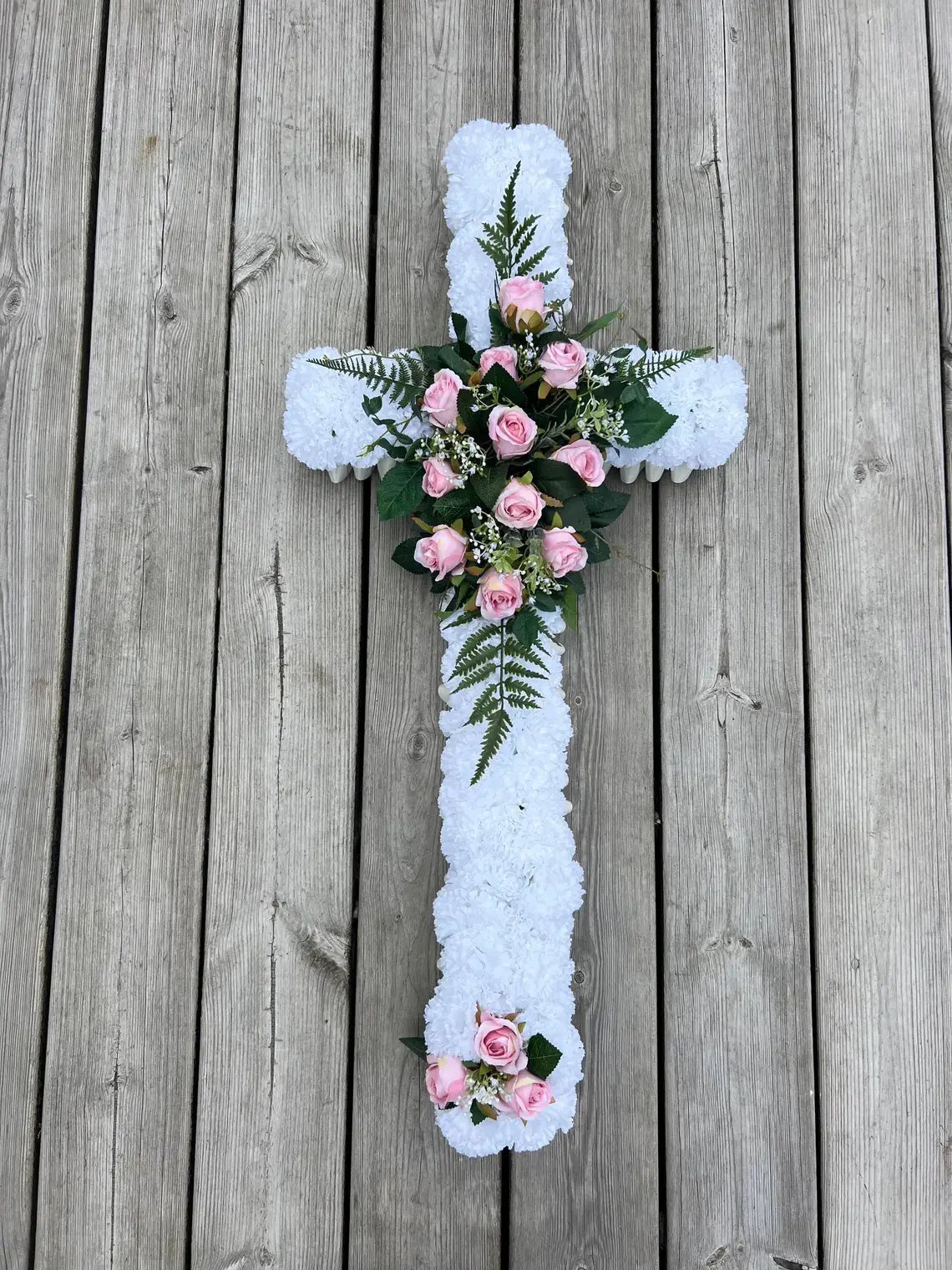 Cross Funeral Tribute – White & Pink Silk Flower Casket Spray, 3ft Artificial Coffin Topper