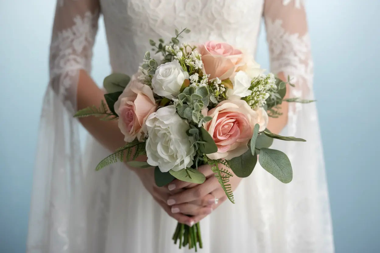 Peach, Nude And White Rose Artificial Wedding Bouquet Package