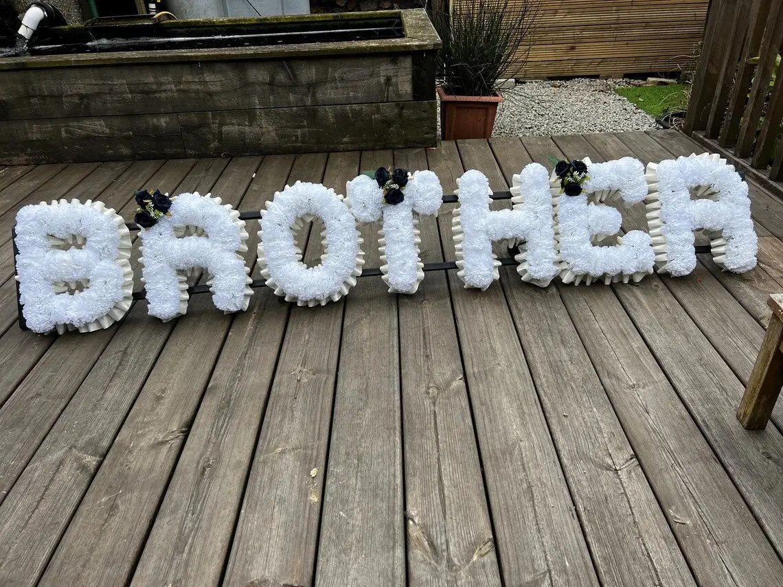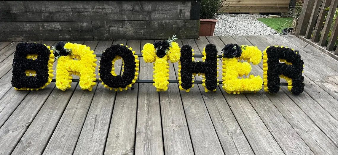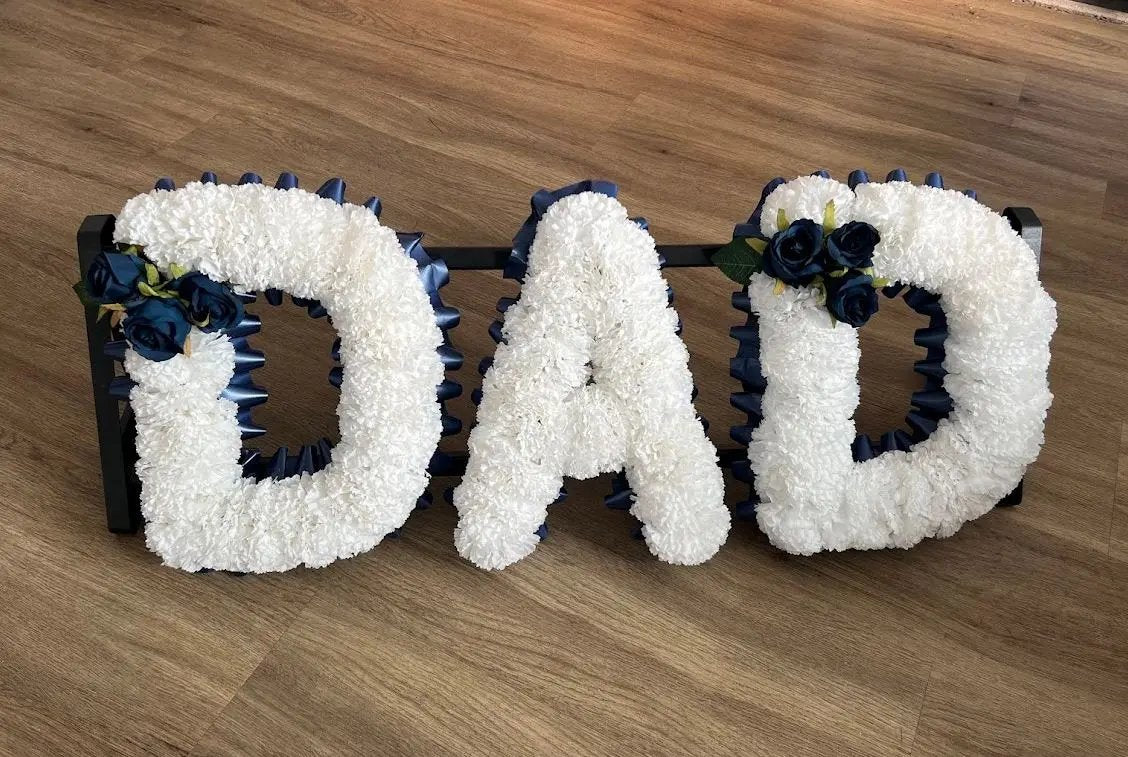Each letter is carefully handmade on a standard tribute frame using premium artificial silk flowers, offering a long-lasting and maintenance-free tribute for funerals, memorials, or gravesides.