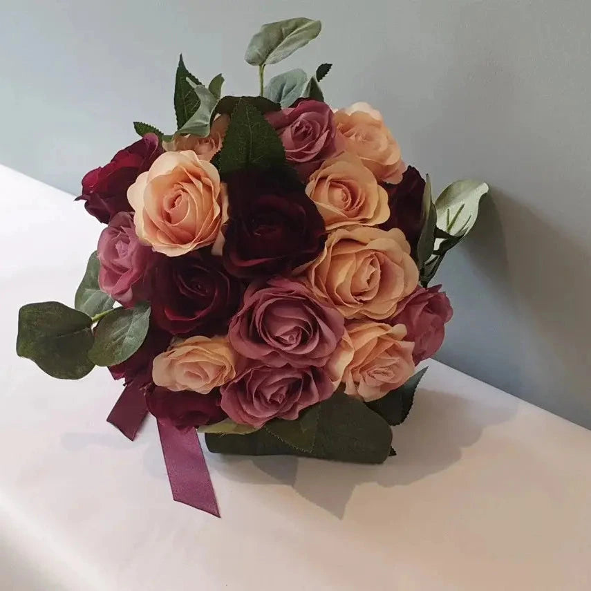 A romantic red and pink bridal bouquet, lovingly handmade with artificial silk roses and greenery.