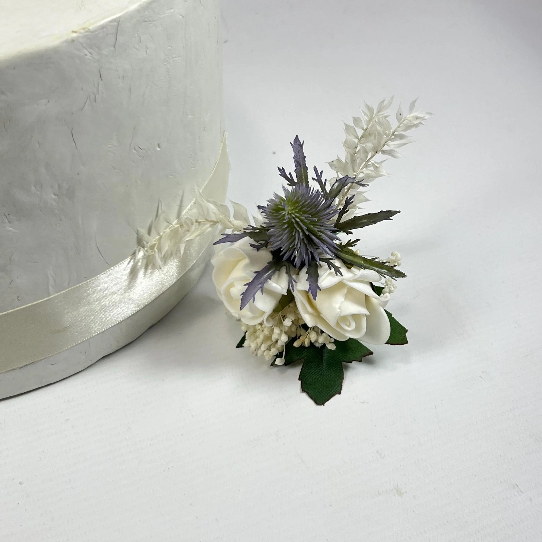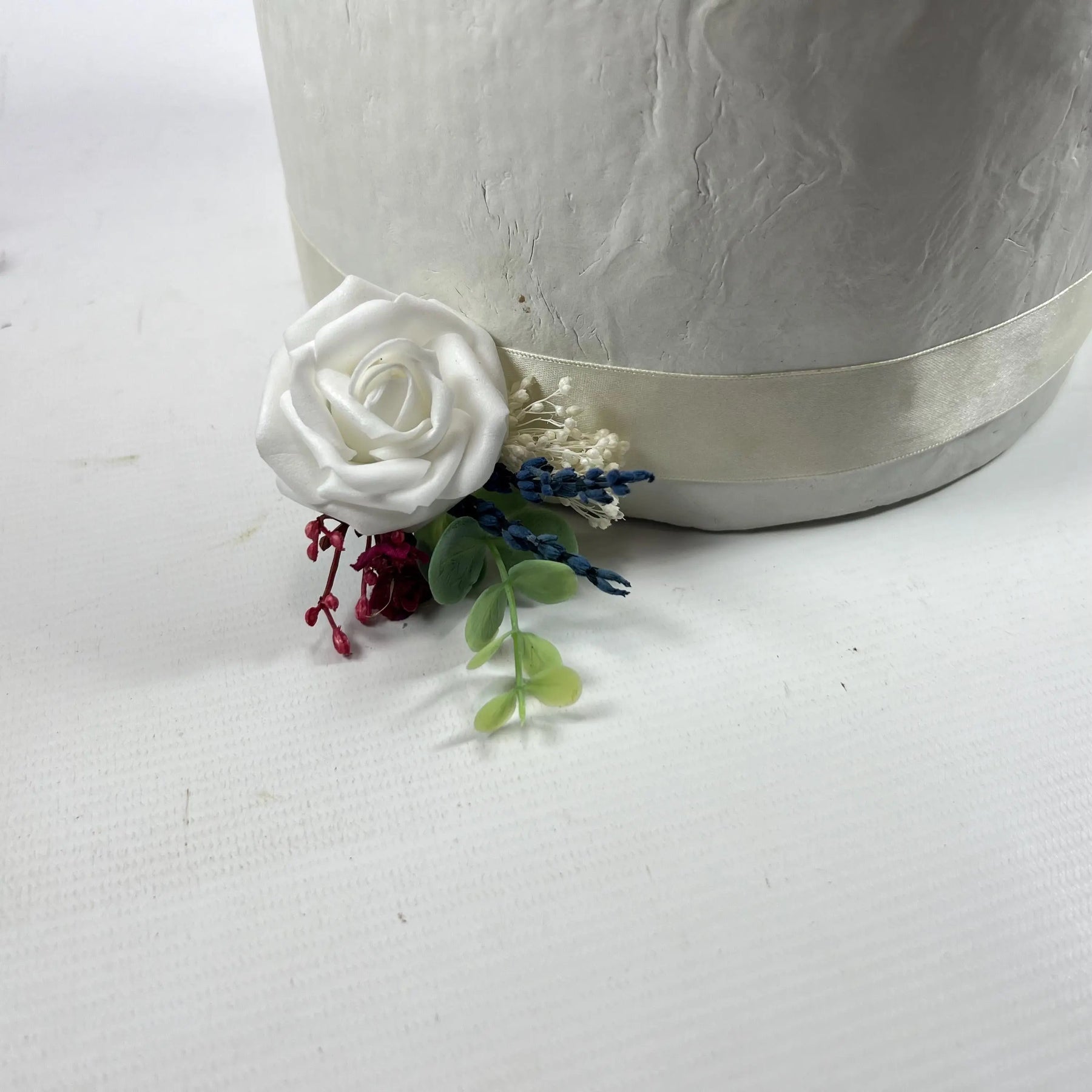 Add a soft yet striking finish to your cake with these beautifully handmade White and Blue Rose Cake Flowers. Created using high-quality silk flowers with preserved gypsophila and ruscus foliage, this elegant cake topper design is perfect for weddings and special celebrations.