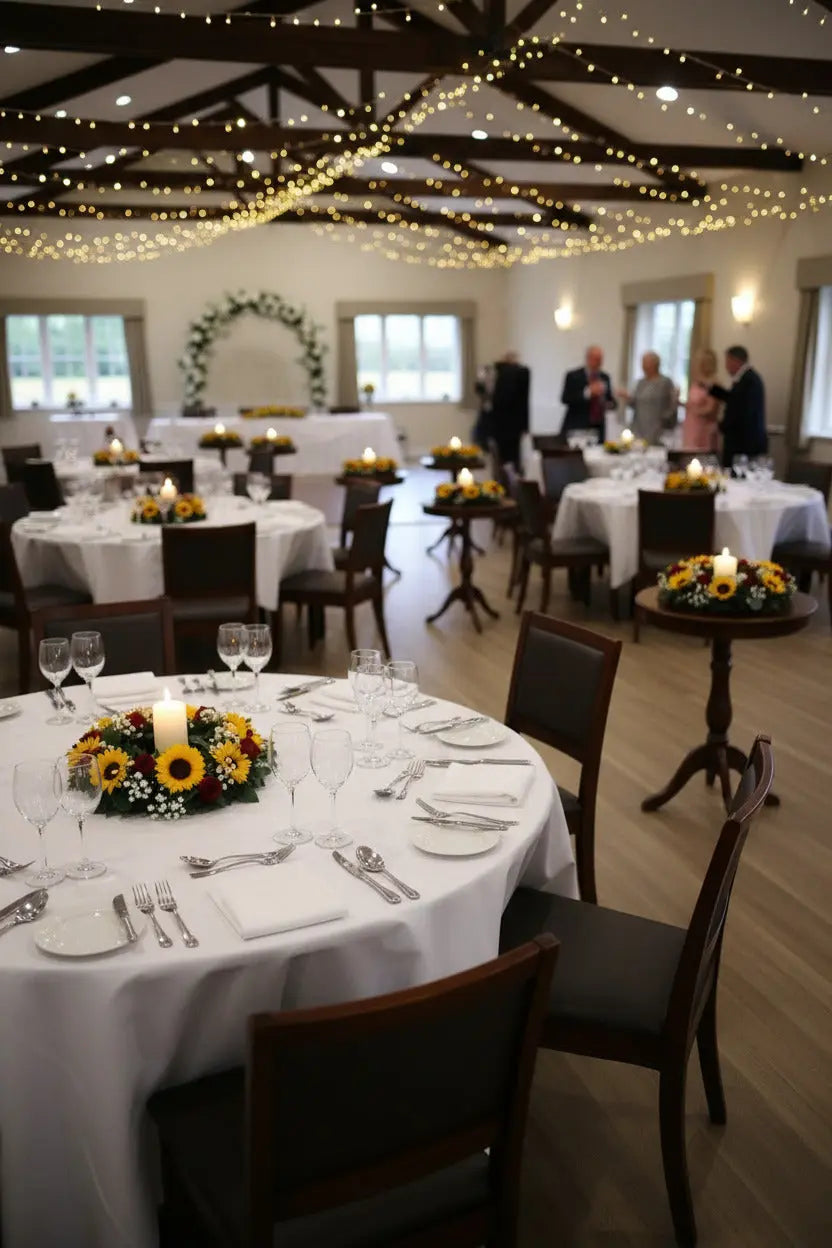 An artificial table wreath serves as a striking centerpiece for any table setting. The vibrant combination of red roses and sunflowers brings warmth and cheer to your space. This beautiful arrangement isn't just visually appealing; it evokes a sense of elegance and sophistication. People are often amazed at how lifelike artificial flowers can appear, and this wreath is a perfect example of that quality. The bold colors and intricate details create a captivating focal point that draws guests’ attention and makes a lasting impression.