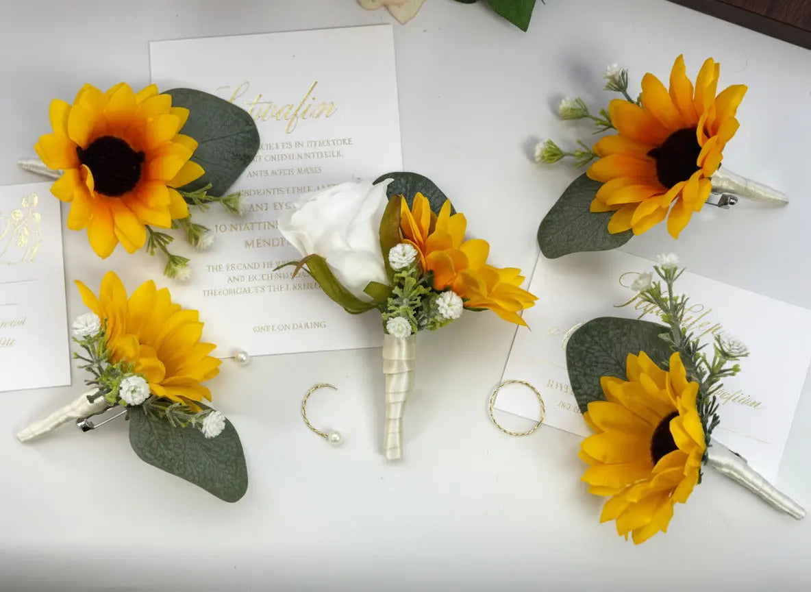 This bridal bouquet features vibrant artificial sunflowers and delicate gyp baby's breath, making it a stunning centerpiece for your wedding day. The use of artificial flowers ensures durability and long-lasting beauty. You can cherish this bouquet for years to come, as it won't wilt or fade. The bright yellow of the sunflowers symbolizes joy and warmth, while the airy gyp baby's breath adds a touch of elegance. This combination not only enhances your bridal look but also serves as a lovely keepsake of your special day.